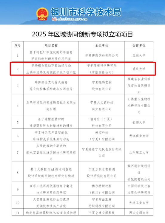 喜訊!近日,昆頂環(huán)保聯(lián)合寧夏環(huán)科院、中國石油天然氣股份有限公司長(zhǎng)慶油田分公司第三采油廠、重慶大學(xué)、寧夏大學(xué)申報(bào)的“多場(chǎng)耦合驅(qū)動(dòng)下石油烴污染土壤淋洗修復(fù)關(guān)鍵技術(shù)及工程示范”項(xiàng)目,成功入選2025年銀川市科技局首批科技計(jì)劃項(xiàng)目。